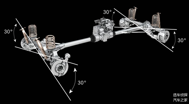 这种结构允许车桥整体实现30° 的摆动角,而传动系统仍保持稳定工作。这意味着,真正发生大幅度运动的是车桥,而不是车架本体。同时,封闭式扭矩管配合高位进气与密封通气系统,涉水深度可达1200 mm。