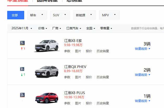 反观江淮自身的几款乘用车产品,以11月零售销量为例,可谓“颇为低迷”。来自专业第三方平台的零售销量数据显示,江淮汽车旗下的江淮X8 E家当月销量仅有3辆,江淮QX PHEV销量为2辆,江淮X8 PLUS则仅有1辆。江淮钇为表现则同样拉胯,钇为爱跑当月零售量仅有217辆,钇为3则仅有79辆,这在新能源火爆的当下,是很拿不出手的。
