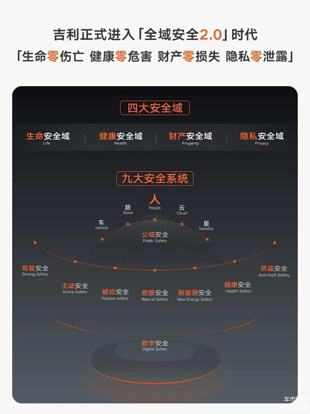 吉利的安全理念演进,其核心是从“整车安全”视角,升级为 “人-车-路-云-星”的生态视角,旨在贯穿出行全场景、联动出行全生态。