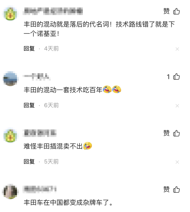 在相关的文章下面,我们就看到了一些非常有代表性的评论,比如“丰田的混动就是落后的代名词!技术路线错了就是下一个诺基亚!”、“丰田的混动一套技术吃百年”、“丰田车在中国都变成杂牌车了。”……这类表述可能看上去就比较极端了,有点戳丰田章男肺管子的意思,但是在国内市场的技术和产品背景下,也不算是言过其实,的确已经出现了相关的情况。