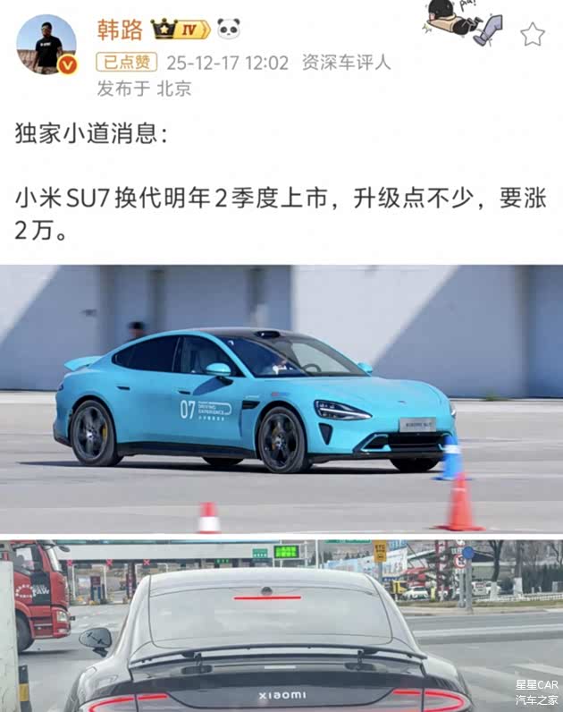 根据著名车评人韩路透露, 小米SU7将于明年第二季度换代,据悉,新车不仅在核心配置上进行了大幅升级,价格还可能上涨2万元。