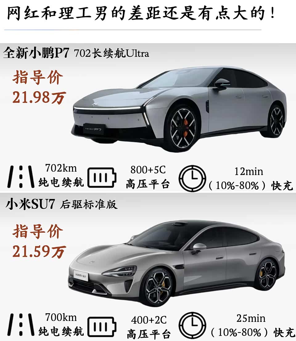 想入手一台家用纯电轿车,都说绕不开小米SU7,但仔细对比完,我却选了小鹏新P7🤔 起售价只差3k多,但配置差出6万多! 小米SU7颜值确实很吸睛,但是冲动过后,却找不到配置上的亮点。 而小鹏新P7除了原创外观以外,还搭配了800V 5C超快充,充电快一倍;还有双腔空悬、一体压铸、前245后275大宽胎,无论是安全还是稳定性都非常出色。座舱配置也比小米更加丰富,Nappa真皮座椅、23扬声器、87寸AR-HUD,智能和舒适感都没打折。