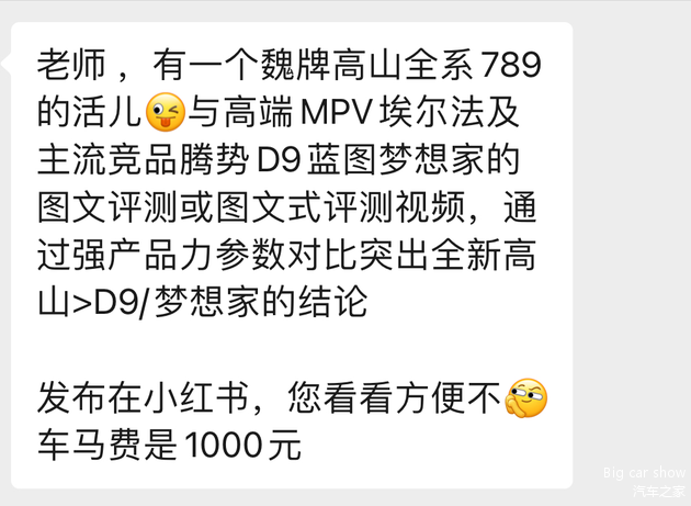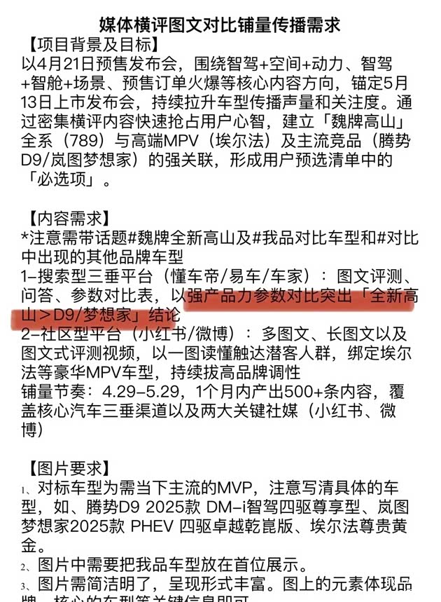以今年4月底高山MPV的加强对比营销传播项目为例,魏牌代理公司向多家媒体约稿,要求围绕“高山>腾势D9/岚图梦想家”原创对比内容,不仅指定要突出“Coffee Pilot Ultra智能系统更优”、“空间更大”,还要求在限定期间产出500+条内容,覆盖热门网络平台。这种“有偿对比竞品”的操作,本身就是“夸大宣传”的变种,很快被媒体指出“吃相难看”。而长城公关部的应对,是立刻和代理公司“切割”,导致已撰稿未发布的媒体被拖欠稿费半年——既没“退”的底线守住营销伦理,也没“退”的体面解决后续纠纷。