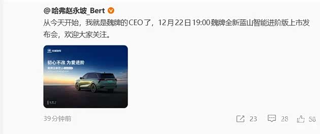 今早,哈弗CEO赵永坡在社交平台上官宣“从今天开始,我就是魏牌的CEO了”,语气随意得像在说“今天中午吃驴火”。没有计划,没有目标,更没表决心——看似轻描淡写,实则透着一股“这摊子不好接”的疲态。毕竟,明天就是蓝山智能进阶版发布会,这时间点换帅,不像阵前点将,倒像临时救火。