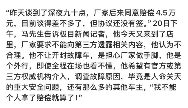 定速巡航和刹车失灵,高速狂飙490km的事件后续来了,车主马先生和4S店协商要求退车退款+5万精神损失费,厂家从最初赔2万涨到4.5万,但要求不能向第三方透露相关内容,马先生认为不合理。