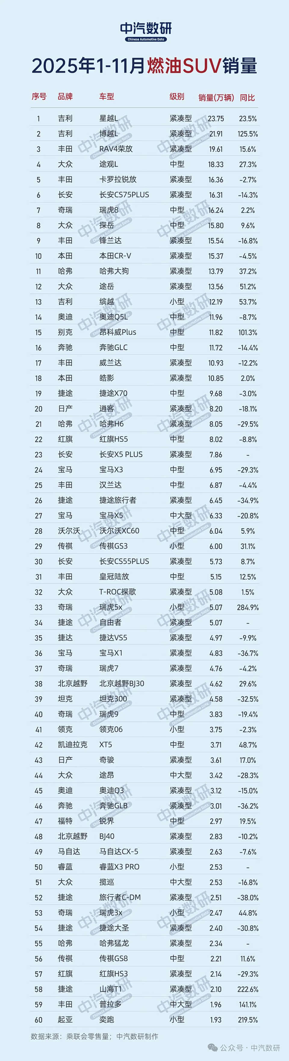 谁说燃油SUV不行了?2025年1-11月,燃油SUV累计销量榜单,同比增长的比下降的更多。其中,吉利、丰田、大众多款SUV均同比增长。而吉利星越L和博越L排在第一和第二位,吉利成了燃油SUV的最大赢家。