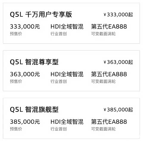 还有一点,新车的预售价虽然降低了,但是配置却全面提升了,比如预售价31.3万元的智混豪华型就配备了云感座椅、自适应巡航、五屏联动、quattro智能四驱、全向主动安全系统等,给人一种物有所值的感觉。