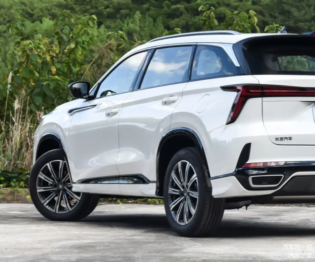 不得不说长安CS75 PLUS在细节打造上更显得豪华感,侧面看起来很霸气,视觉上也能带来很高的感受,特别是加上铝合金行李架后更显得高大。用料细节也能衬托出豪华感,比如车窗边缘、侧裙以及A柱位置都有烤漆材质来烘托。轮毂造型也是非常时尚化,只是18英寸轮毂看起来没有那么大气,我觉得20英寸轮毂更适合它。尾部的翼子板也是黑白搭配,并配有两个圆形的高位刹车灯,下部为贯穿式尾灯,整体设计较为细长,为了突出运动感也加入黑化元素。但双边双出的排气是假的,排气是采用隐藏式布局的。空间优势还是有的,长宽高为4710*1865*1710毫米,轴距为2710毫米。