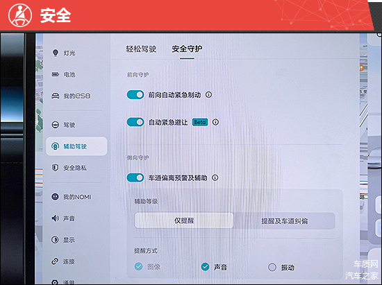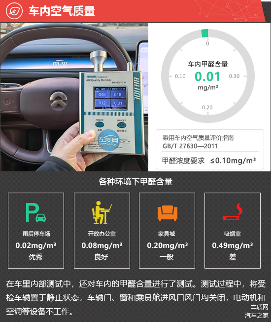 在车内空气质量测试环节,将车辆放置在车辆较少的内部地面停车场中,实测2026款蔚来ES8的车内甲醛含量为0.01mg/m3,符合2012年3月1日起实施的,由原环保部和国家质量监督检验检疫总局联合发布的《乘用车内空气质量评价指南》(中华人民共和国国家标准GB/T 27630-2011)中的相关标准。