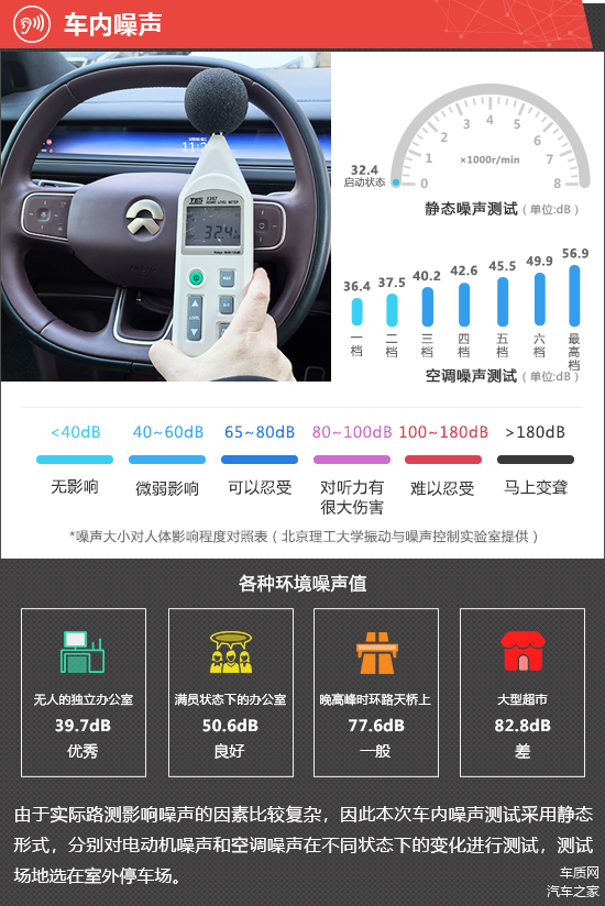 在静态噪声测试环节,2026款蔚来ES8在启动状态下车内实测噪声值为32.4dB,在测试过的同级别车型中处于中上游水平。