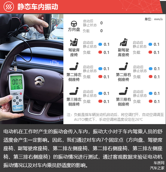 在静态车内振动测试环节,启动后静止和负载两种状态下,2026款蔚来ES8方向盘位置的振动数值始终为0,全车座椅的振动数值处于较低水平且保持不变,实际体感轻微。