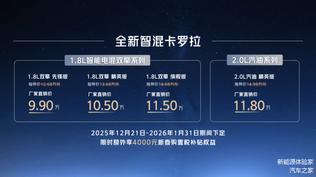 12月21日,“全球好品质 中国新家轿”全新智混卡罗拉焕新上市,共推出4个版本,厂商直销价为:9.9万元-11.8万元。即日起至1月31日期间下定,限时额外享受4000元新春购置税补贴权益。