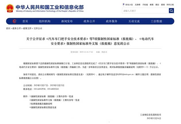 核心要求很简单:每个车门应配备机械释放车门外把手;每个车门应配备至少一个机械释放车门内把手;车门内把手应配备符合要求的永久性标志;车门内把手附近应增加能表明开启方式的中文或图示说明;车辆产品使用说明书应包括车门把手的使用说明;对车门把手进行试验,试验过程中车门把手不应断裂或脱落,试验后车门把手应能开启车门。《汽车车门把手安全技术要求》建议实施日期为2027年1月1日。