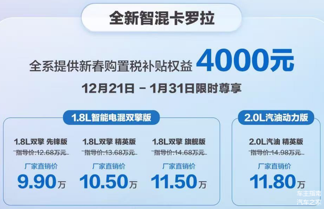 1、1.8L双擎版:指导价12.68-14.68万元,厂家直销价9.90-11.50万元;