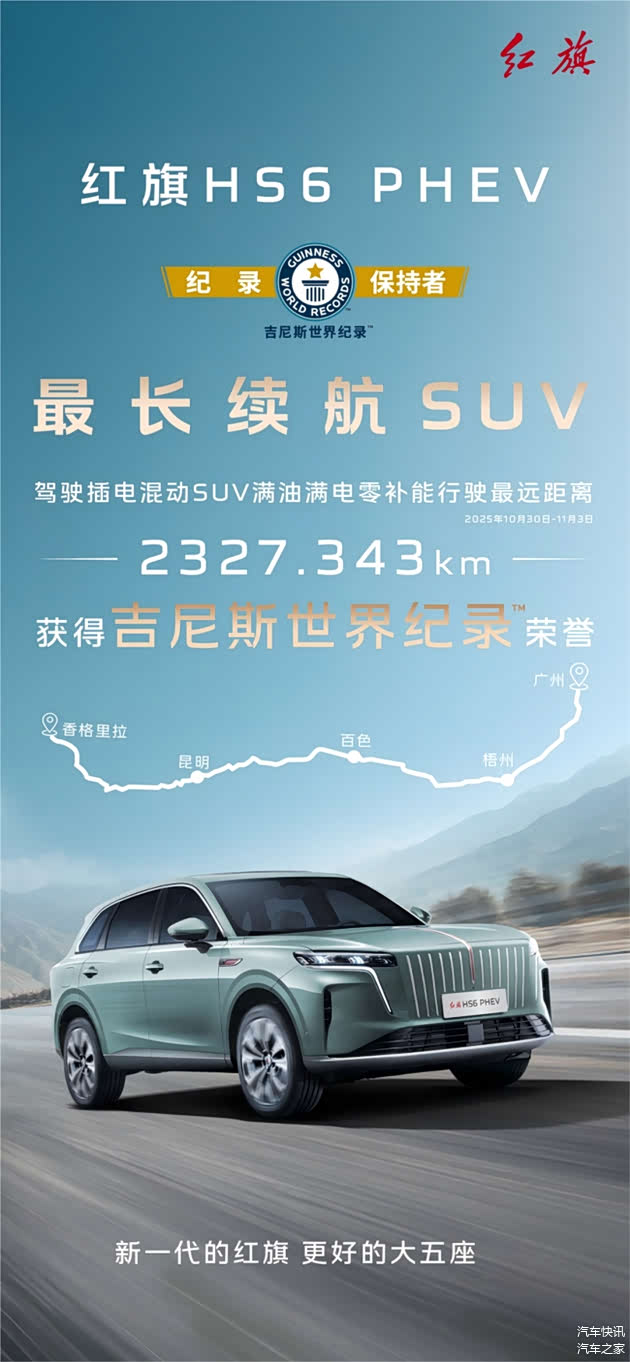 红旗HS6依托全新一代鸿鹄混动技术,在续航与能耗方面表现亮眼。车型续航版本丰富,CLTC工况下,145智混版纯电续航148km、综合续航1580km;240智混版纯电续航248km、综合续航1650km;220四驱智混版纯电续航228km、综合续航1460km。日常匮电通勤情况下最低油耗仅5.1L/100km,用油成本低至0.3元/公里,可为家庭降低用车成本。其搭载的4C高性能快充电池,20%~80%充电仅需15min,利用购物、休息的间隙即可完成补能,大幅提升出行效率。该车于今年11月以2327.343公里的满油满电零补能行驶里程,成功摘得插电混动SUV类别下的一项吉尼斯世界纪录。#中国混动破世界纪录#相关话题火速登顶微博热搜,真实可考的实测数据,直接凸显了红旗HS6续航的超强实力与稳定属性。