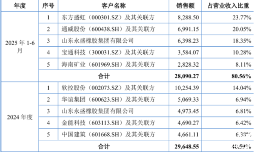 其中,报告期内第一大客户软控股份及其关联方的销售收入占比分别为38.28%、28.18%、14.04%和0.23%,年度销售占比逐年下降,2025年上半年,软控股份的销售金额占营业收入的比例仅为0.23%,不再为当期前五大客户,而同时公司第一大客户变更为东方盛虹(000301.SZ)及其关联方,销售额为8288.50万元,占营收比重为23.77%。