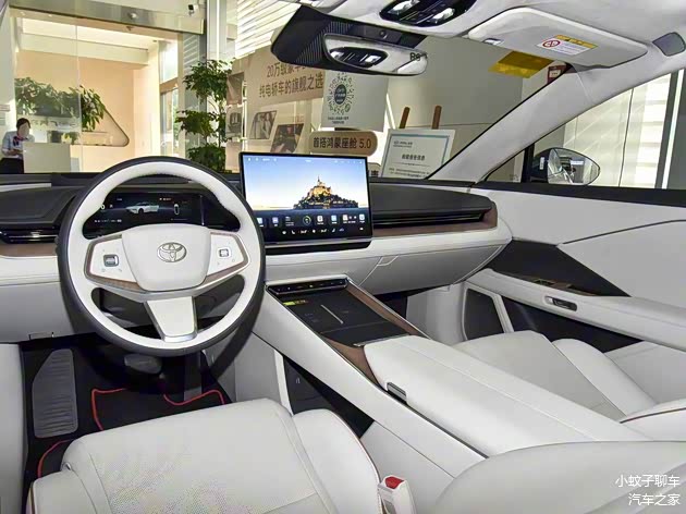 具体来看,外观方面,单看铂智7的车身尺寸,就足以知道它的定位比较高端,该车长宽高分别是5130/1965/1506mm,轴距为3020mm,整车线条十分修长,而且设计也很出彩。前脸部分这台车仍然采用丰田目前最新的“锤头鲨”设计语言,封闭格栅、C型灯组搭配贯穿式灯带,使得整个前脸看起来进攻性十足,车身侧面采用溜背轿跑设计,线条流畅舒展,搭配前后无边框车门以及21寸大轮毂,运气气息营造得相当到位,同时配备了长三角窗,以此增加行政体验。至于车辆尾部,车顶天幕与后车窗连成一体,贯穿式尾灯点亮后也是极具辨识度。