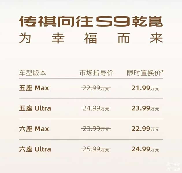 其一,售价偏高,性价比不足,抬高了购车门槛。传祺向往S9上市指导价区间为22.99万-25.99万元,即便限时置换价下调至21.99万-24.99万元,仍缺乏价格竞争力。