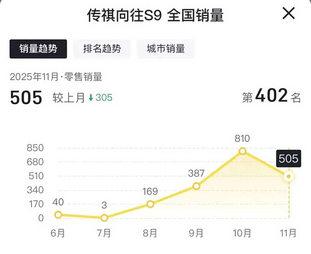然而,亮眼的配置没能转化为市场销量。作为华系新晋车型,传祺向往S9的市场表现与同门兄弟形成鲜明反差——后者轻则月销万辆,即便表现稍弱也能超5000辆,而传祺向往S9还是三位数销量区间。