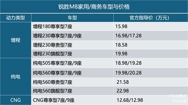 不过,相比价格本身,锐胜M8更显著的特点在于其丰富的动力模式选择——涵盖增程、纯电、CNG三种动力形式,同时提供7座与9座布局,可适用家用、商用多场景,在售车型数量达到18款。对于首次接触这一车型的消费者而言,选车过程中很容易出现“价格接近,却不清楚配置差异和适用场景”的困惑。本篇购车手册通过梳理车型动力、配置梯度与适用场景,帮助消费者快速判断:哪一类动力适合自己、哪个配置层级更值得选。