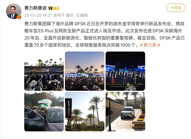 日前,赛力斯集团副总裁康波在微博上表示:“赛力斯集团旗下海外品牌DFSK近日在开罗的胡夫金字塔旁举行新品发布会,携战略车型E5 Plus及两款全新产品正式进入埃及市场。”