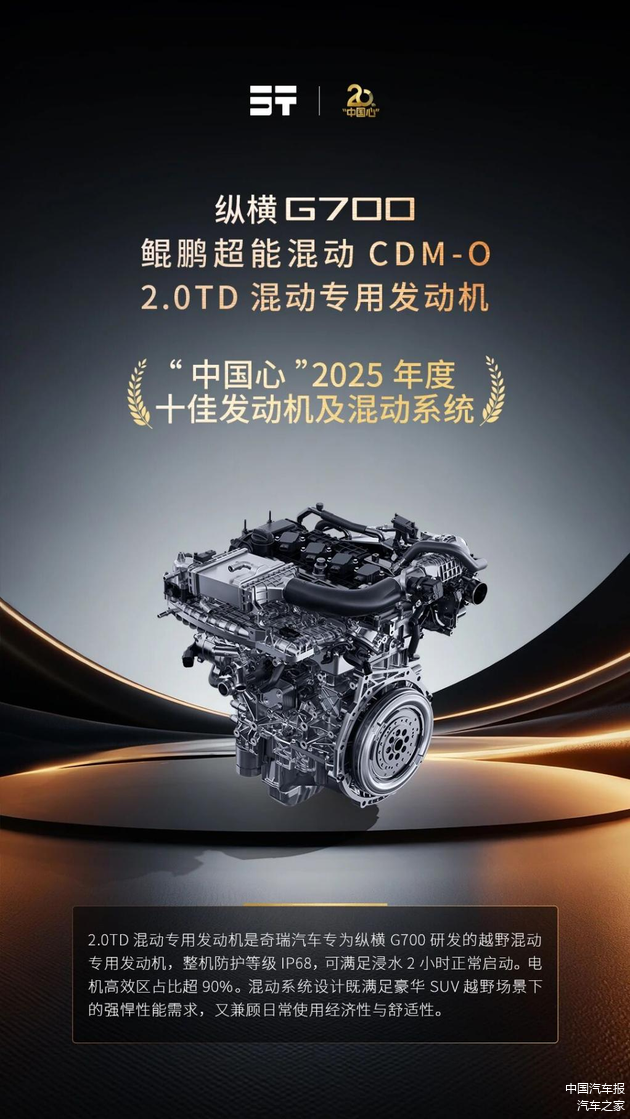 奇瑞的技术积累并非只停留在实验室,而是获得了行业权威机构的认可。纵横G700搭载的鲲鹏超能混动CDM-O 2.0TD系统入选“中国心”2025年度十佳发动机及混动系统,这是奇瑞第12次获此荣誉。风云T11搭载的鲲鹏黄金增程CEM系统、星际元ES搭载的鲲鹏超能电驱AEH240分别荣膺“世界十佳增程系统”和“世界十佳电驱动系统”称号,搭载相关技术的车型也获得了“世界十佳增程车型”“世界十佳电动车型”以及“世界十佳智能汽车”等多项大奖。此外,风云A9L的智能座舱亦获得J.D. Power的权威肯定。这些来自第三方的评价,证明奇瑞在新能源核心技术与智能化赛道已建立起显著优势。