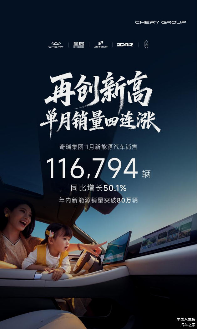 日前,中国汽车流通协会乘用车市场信息联席分会发布最新数据,在11月新能源厂商批发销量排行榜中,奇瑞集团(以下简称“奇瑞”)首次跻身行业前三。当月,奇瑞销售新能源汽车116794辆,同比增长50.1%,实现“四连涨”;1~11月新能源汽车累计销量突破81.4万辆,同比增长69.4%。按此势头,全年新能源销量逼近百万辆已成定局。这一排名变化,是奇瑞长期技术积淀、精准产品矩阵与清晰战略路径共同作用的必然结果,更是新能源汽车市场竞争格局的一次重要洗牌。