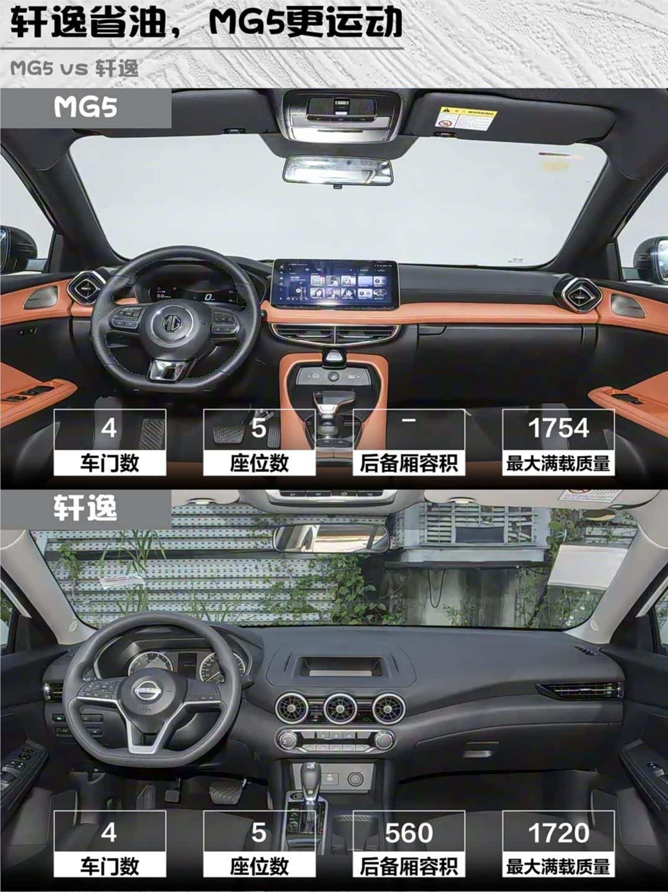 MG5的12.3英寸大屏+360全景影像对新手太友好了!还有电子挡把和语音控制天窗/空调。轩逸丐版连倒车影像都要自己加装,中控屏像MP4播放器📼 但人家后排能跷二郎腿,后备箱560L超大容量,搬家都能塞下小冰箱!