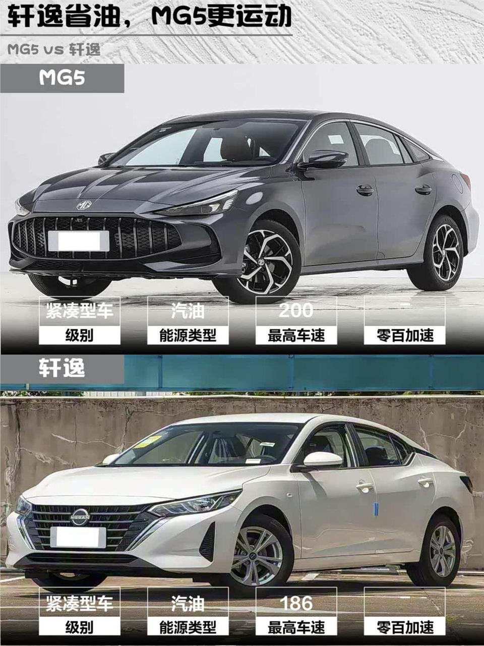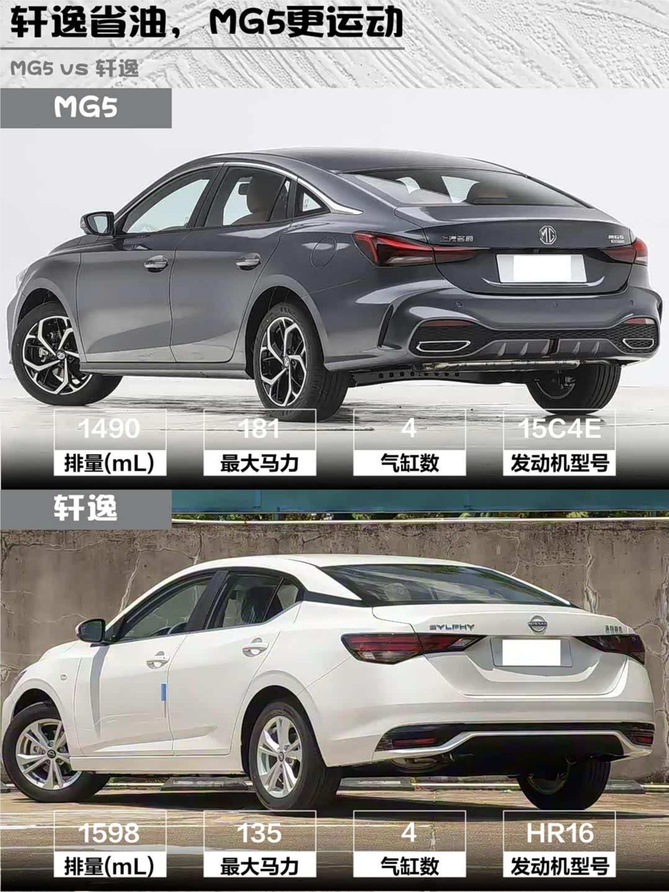 MG5的1.5T发动机181马力+7速湿式双离合,红绿灯起步推背感明显,高速超车根本不虚!实测0-100km/h比轩逸快2秒多。轩逸的1.6L+CVT就像温顺的绵羊🐑,平顺省油但急加速要提前3秒踩油门...不过WLTC油耗5.94L/100km确实香,比MG5省0.5个油。