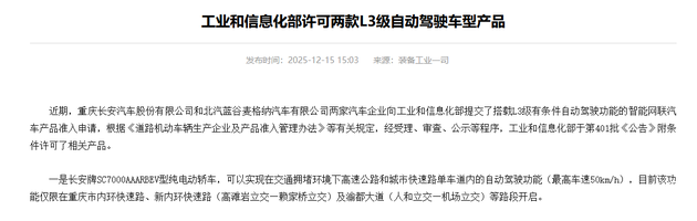 2014年,先搭起了驾驶辅助技术的研发骨架;2017年,正式锚定L3级自动驾驶展开专项攻关;2021年,又把这些技术搬到深蓝系列车型上做实地验证,让技术在市场反馈中不断打磨。到了关键的冲刺阶段,它的节奏更是没掉过链子:2024年6月,跻身首批L3级自动驾驶准入试点;2025年2月,率先跑完产品测试和安全评估的全流程;12月15日,拿到L3级车型的产品准入许可。每一步都踩在点上,这才有了拿下首块号牌的底气。