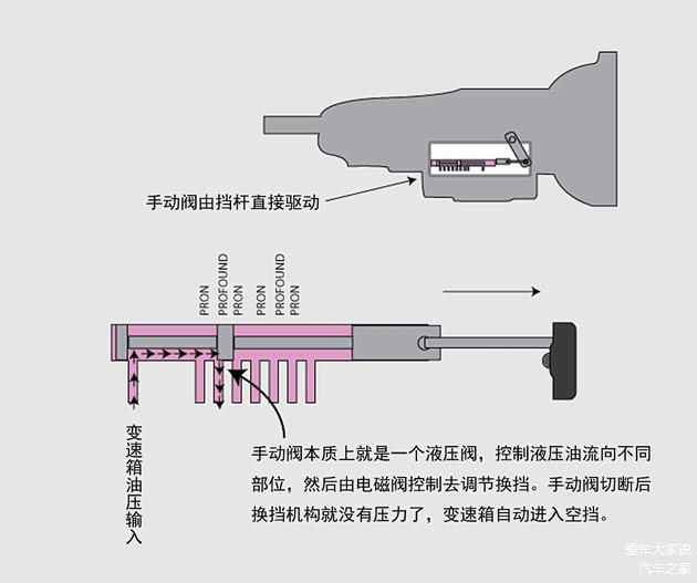 如果你的车是机械挡杆,那么挂N挡有9成概率可以直接解决危机。因为自动变速箱虽然会自动换挡,但前进(D)、后退(R)、空挡(N)是完全由司机决定的。变速箱上面有个手控阀,挂不同挡位它就接通不同的油路,然后才轮到电脑去控制。所以只要把手控阀推到N挡,油路直接关闭,变速箱会强行进入空挡。