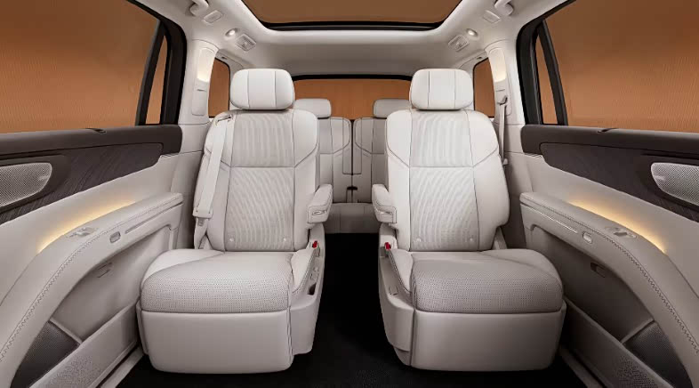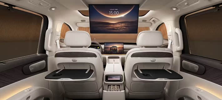 二排头等舱:核心亮点是二排“零重力”座椅,支持120°躺姿、4向腿托,并集成小桌板、车载冷暖冰箱(8.1L)及智能香氛系统,舒适配置拉满。
