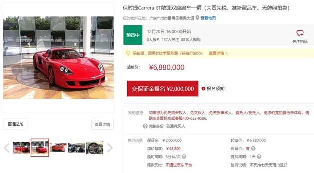 拍卖信息显示,有375人选择了关注,在这些关注的人中,有车迷、有潜在买家,部分潜在买家之所以没有报名,是感觉688万的起拍价高了+无牌照拍卖(因国标不能上国内牌照),如果二拍降价,想必报名的人会增加,增加多与少,完全看二拍的起拍价,正所谓没有卖不出去的车,只有卖不出去的价格,到这里不得不感叹一下,同样是卡雷拉GT,一辆成功拍卖2000万出头,一辆688万没谈拢,这属于同车不同命,有时候,车的命运和人的命运有相似之处。