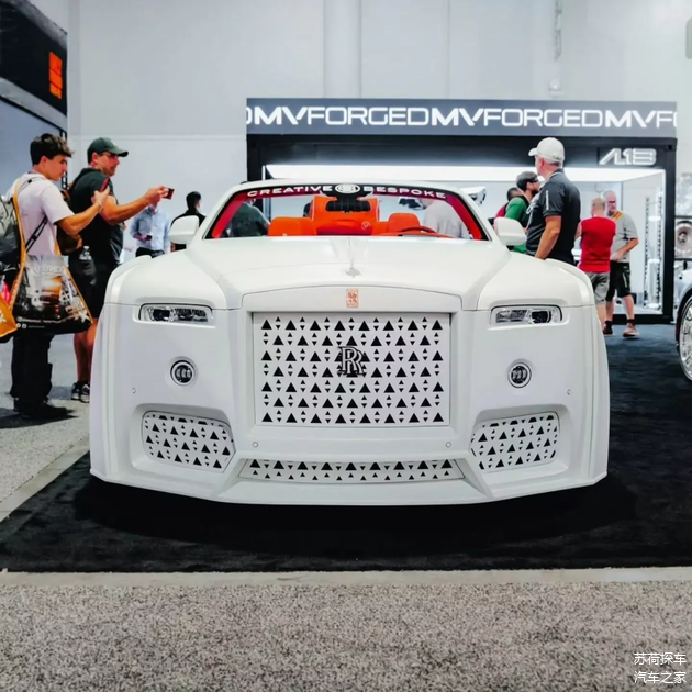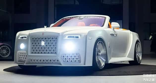 外观方面,劳斯莱斯曜影限量版通体采用了白色涂装,最吸睛的变化就是车头。由一块布满三角形几何图案孔洞的白色塑料板取代了标志性的镀铬格栅。对,你没看错!就是白色塑料。而且这种元素也被应用在了雾灯以及下方进气口区域,整体看起来有种未来感。另外,一对圆形的辅助灯从保险杠突出,而原厂大灯则被车身套件部分遮挡。标志性的欢庆女神立标也采用了白色涂装,双R车标则变成了与内饰同色调的橙色。