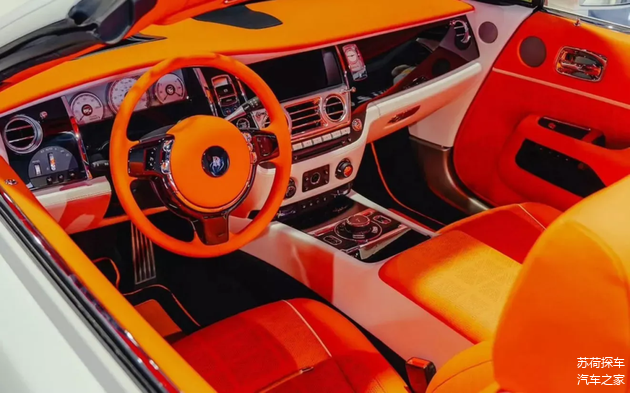 内饰说实话相当有夜店风,采用高对比度的白色和橙色皮革拼接而成,饱和度相当高。车内的布局则沿袭了普通版劳斯莱斯曜影的设计理念,保留了大量的物理按键和机械结构,整体营造出了相当强的复古感,再加上如今橙白色的内饰,整体给人的感觉一言难尽,确实像是迪拜改装品牌能设计出来的东西。