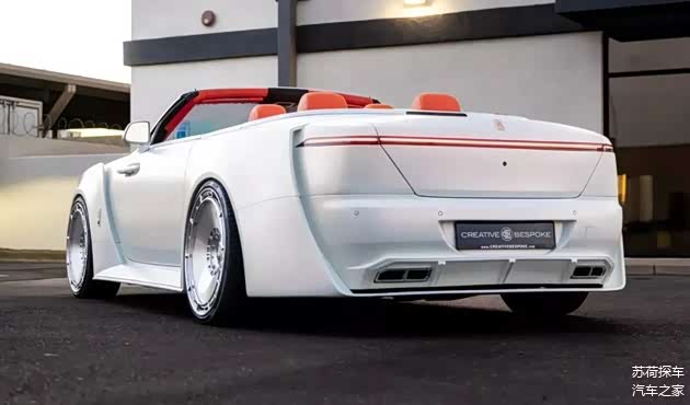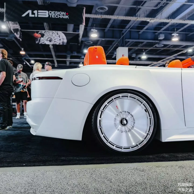 侧面前后翼子板进行了重新设计,搭配夸张的侧裙造型,进一步拉长了整车的车身轮廓。翼子板处也有橙色双R车标及改装厂的标识。另外,轮毂也进行了重新设计,大饼式造型看起来颇具复古感。