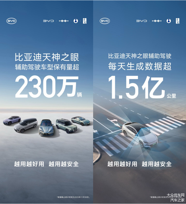 数据显示,截至2025年11月底,比亚迪搭载“天神之眼”驾驶辅助系统的车型累计销量已突破230万辆,持续蝉联中国辅助驾驶车型销量及系统装车量榜首。这标志着比亚迪推动的“全民智驾”战略已取得显著成效,智能驾驶正从高端配置加速向主流市场普及。