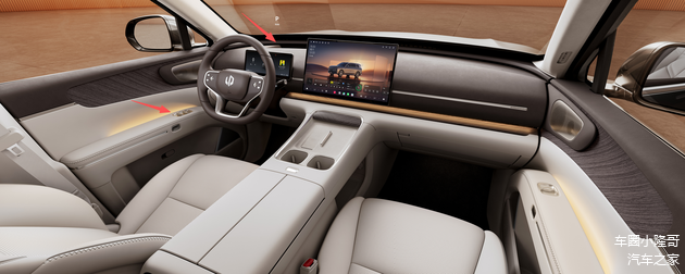 车内的仪表台和门板位置采用了木纹装饰,但这木纹的设计偏暗,车内配备了悬浮式中控屏和仪表屏,副驾驶屏依旧没有配备。