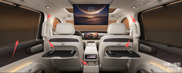 第二配座椅采用了零重力座椅,并且配备了小桌板(带嵌入式杯托设计,可轻松放置平板、手机等产品)、吸顶屏,遮阳帘,另外车载冰箱的配置也已经确定了。