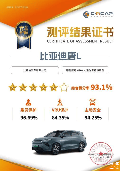 值得一提的是,唐L更是中国品牌最安全的大七座SUV,成功通过中汽中心多项严苛测试,以93.1%的超高得分率,荣获C-NCAP超五星安全认证!唐L作为同级唯一一款超五星评级车型,让顶尖安全技术从“选配”变成“标配”。