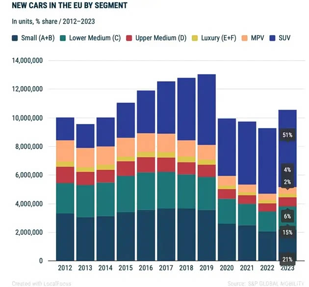 而且,虽然欧洲国家面积小,国与国之间距离短,且弯多路窄,确实很适合开小车,但欧洲人买车也并非追求“越小越好”。欧洲汽车制造商协会(ACEA)统计了2012-2023年欧洲市场各级别车型的市场份额趋势,小型车的份额在这12年间整体呈现萎缩的趋势——有数据统计,2010年,小型车销量占欧洲市场的10%,但到2025年上半年,这一比例仅降至3.8%。反倒是过去外界以为欧洲人不感冒的SUV,其市场份额却在提升。