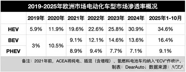 但比起产品力不足可能造成的市场反响冷淡,增长放缓的纯电动车需求或许才是最为致命的。据ACEA统计,今年前10个月,欧洲BEV市占率为16.4%,与2024年相比上涨2.8个百分点。作为对比,享受相对更少政策补贴的PHEV,份额也上涨了2个百分点,而几乎不享受政策补贴的HEV份额则上涨了3.7%。