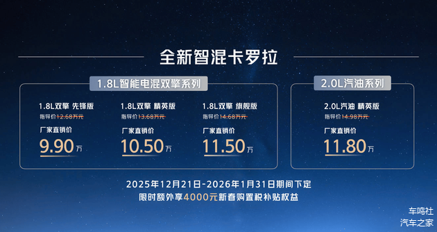 12月21日,“全球好品质 中国新家轿”全新智混卡罗拉焕新上市,共推出4个版本,厂商直销价为:9.9万元-11.8万元。即日起至1月31日期间下定,限时额外享受4000元新春购置税补贴权益。