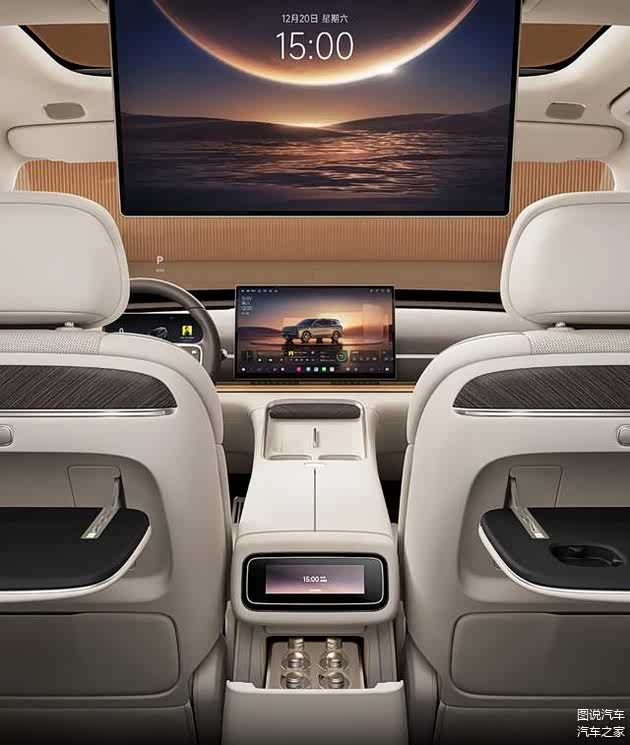 从这个视角看,两个小桌板,冰箱安排了,中央通道的小液晶屏也有,第二排的娱乐屏也够大,这么看的话,这个设计风格实际上和深蓝S09比较类似,你可以说设计感一般,但是也丑不到哪里去。当然,等老图哪天看到实车了,还会再做一期动态视频解读。