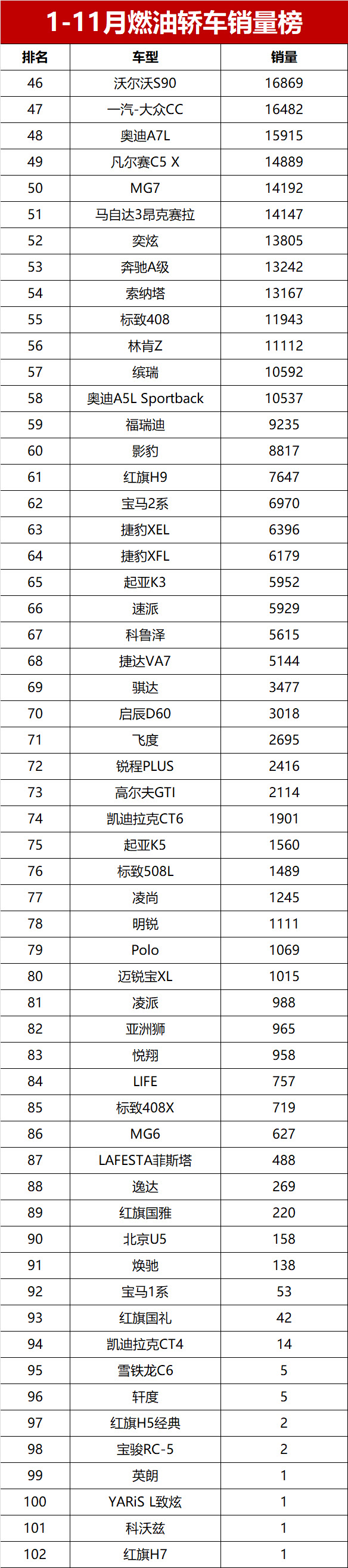 小众及高端运动型燃油轿车中,沃尔沃S60、凯迪拉克CT5分别以22054辆和36874辆的销量排名第39和34位;马自达3昂克赛拉累计销量14147辆,排名第51位;部分曾经的热门燃油车型则沦为边缘,前几年月均销量过万辆的雪佛兰科鲁泽,1-11月累计销量只有5615辆;“车市常青树”本田飞度累计销量只有2695辆,而大众Polo的销量则只有1069辆。