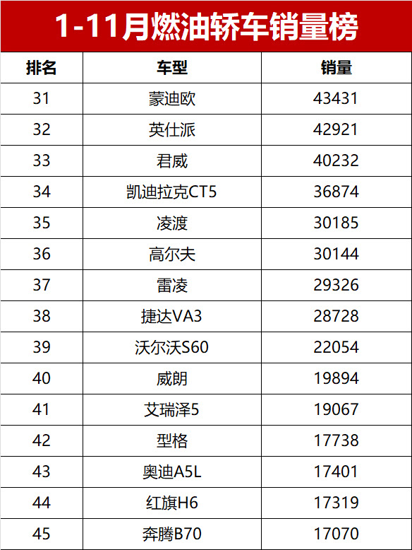 其他合资燃油轿车中,一汽-大众宝来以75201辆的销量排名第21位,现代伊兰特以56288辆排名第25位,日产天籁以53564辆位列第27位;美系燃油轿车方面,别克君越、君威分别以52070辆和40232辆的销量排名第28、33位,福特蒙迪欧以43431辆排名第31位。