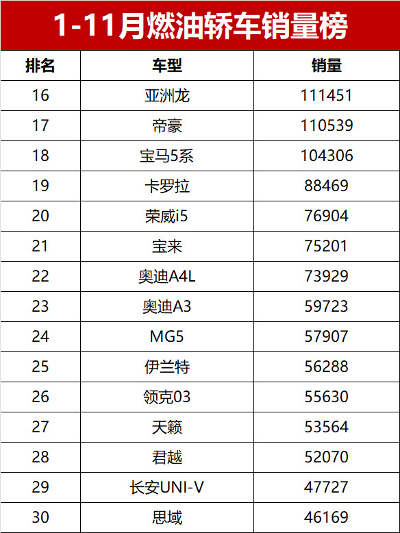 日系合资燃油轿车中,除凯美瑞外,本田雅阁以133155辆的销量排名第12位,丰田亚洲龙以111451辆的销量位列第16位;而曾经的销量热门车型丰田卡罗拉则表现疲软,累计销量仅88469辆,排名跌至第19位,较往年排名大幅下滑。本田思域的表现同样不尽如人意,以46169辆的销量排名第30位,未能进入销量第一梯队。