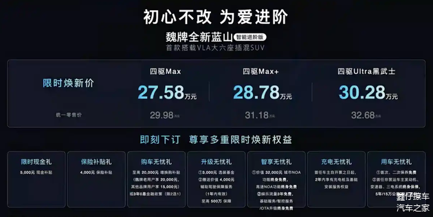 日前,我们从长城汽车官方获悉,魏牌蓝山智能进阶版正式上市,新车在产品命名上已经给出清晰指向,并非平台或动力结构的重构,而是围绕驾驶辅助与座舱智能体系完成一次集中式升级。本次共推出三款配置版本,官方指导价29.98-32.68万元,同时叠加限时焕新价格体系,限时焕新价27.58-30.28万元。实际购车门槛进一步下探。从产品节奏来看,蓝山智能进阶版并不是独立换代车型,而是在现有架构成熟度较高的前提下,通过软件、算力和交互层面的集中补强,拉长整车产品生命周期,也为后续智能功能持续OTA预留空间,这一点对注重长期使用体验的家庭用户尤为关键。