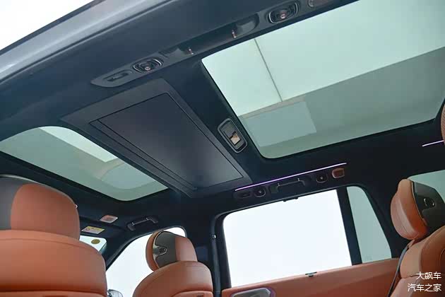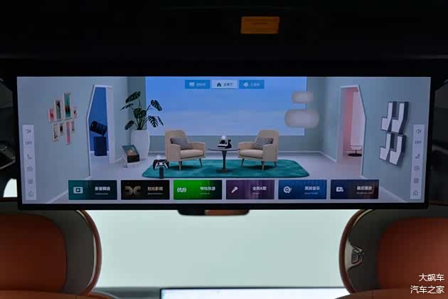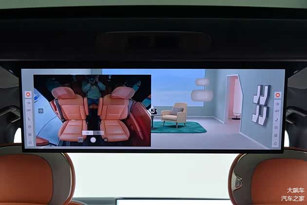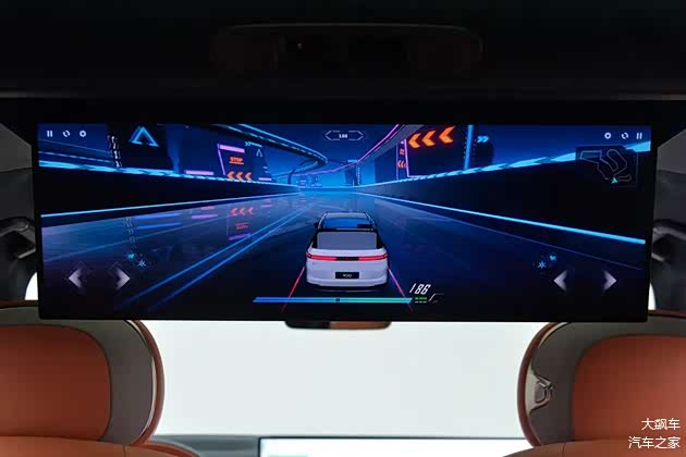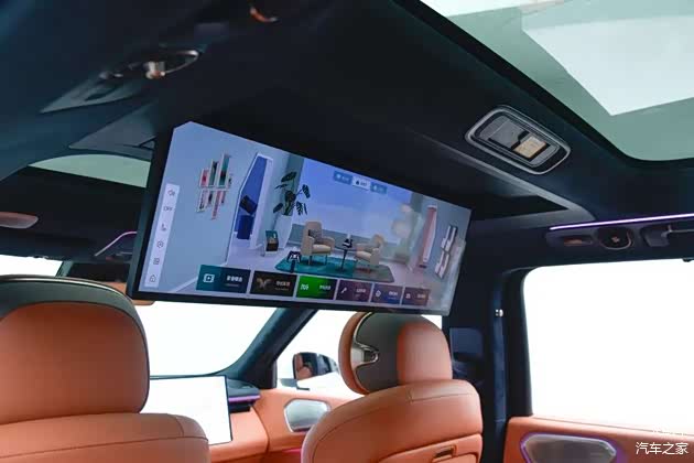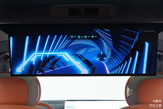 顶棚是分段式全景天窗,中央有一块超大液晶屏。