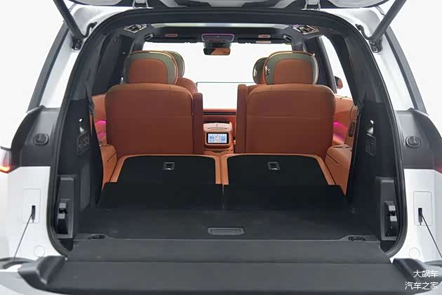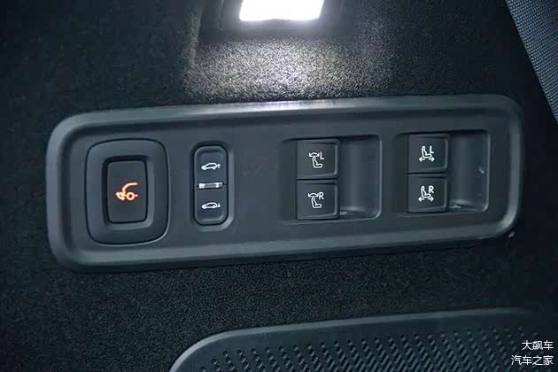 后备厢位置有一组按键,可以调节第三排座椅前后、靠背角度以及放倒。同时,还能控制空气悬架的高低升降。另外,还有一个控制后拖钩的按键。